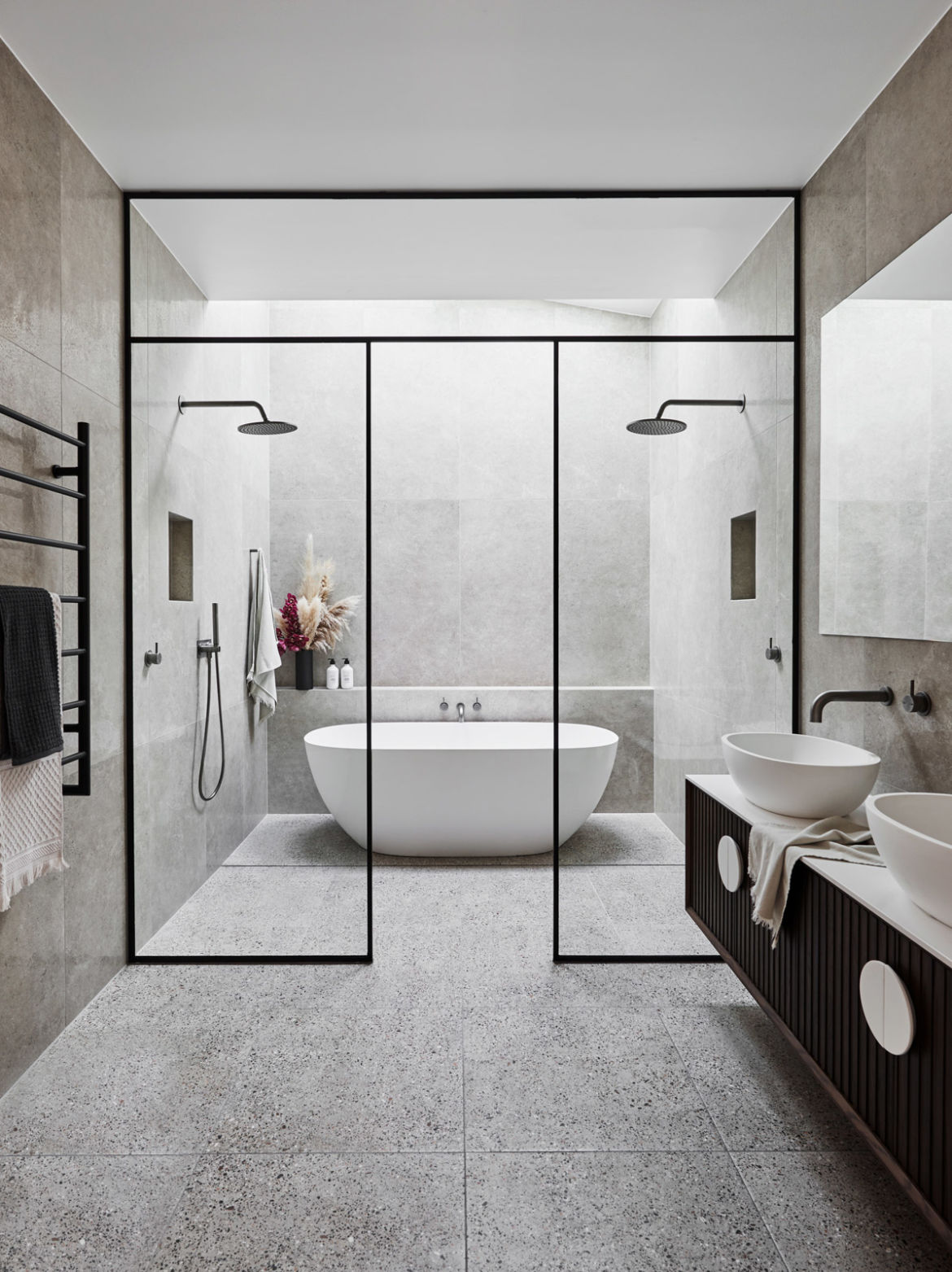 比如淋浴房的地面使用防水耐水性好的地磚或馬克,而在衛生間入口和洗漱臺則使用防水的室外地磚。如果浴室需要安裝浴缸,那么可以安裝玻璃隔斷或浴簾進行遮擋并干濕分離。