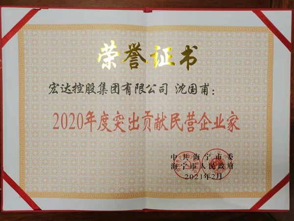 2021年2月19日上午在海寧市“高質(zhì)量發(fā)展開啟新征程”暨全市三級(jí)干部大會(huì)上,公司董事長(zhǎng)沈國(guó)甫同志榮獲”突出貢獻(xiàn)民營(yíng)企業(yè)家“,市委書記曹國(guó)良為沈董事長(zhǎng)頒獎(jiǎng)。