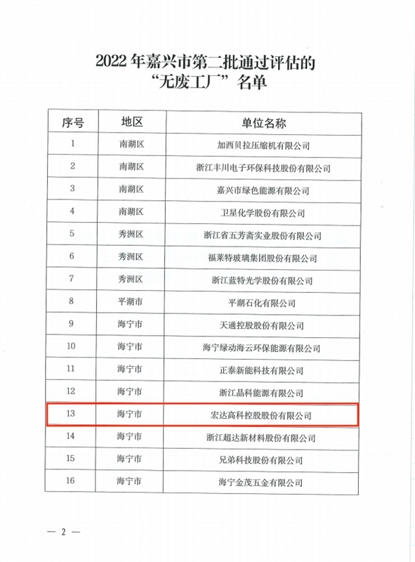 近日,根據(jù)嘉興市生態(tài)環(huán)境局和嘉興市經(jīng)濟(jì)和信息化局文件,宏達(dá)高科被評(píng)為2022年嘉興市第二批“無(wú)廢工廠(chǎng)”。