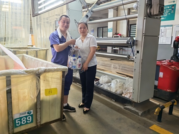在“宏達高科”溫度最高的染整定型、染整染色車間,公司管理人員向堅守崗位的一線員工表示親切的慰問和感謝,為他們送上毛巾、沐浴露等清涼用品,囑咐大家高溫生產(chǎn)不忘安全,做到勞逸結合,并要求各部門切實做好防暑降溫工作,保障員工健康安全。
