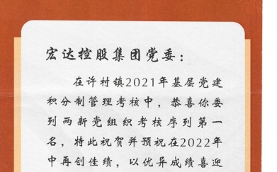 宏達(dá)控股集團(tuán)黨委在許村鎮(zhèn)2021年基層黨建積分制管理考核中,委列兩新黨組..