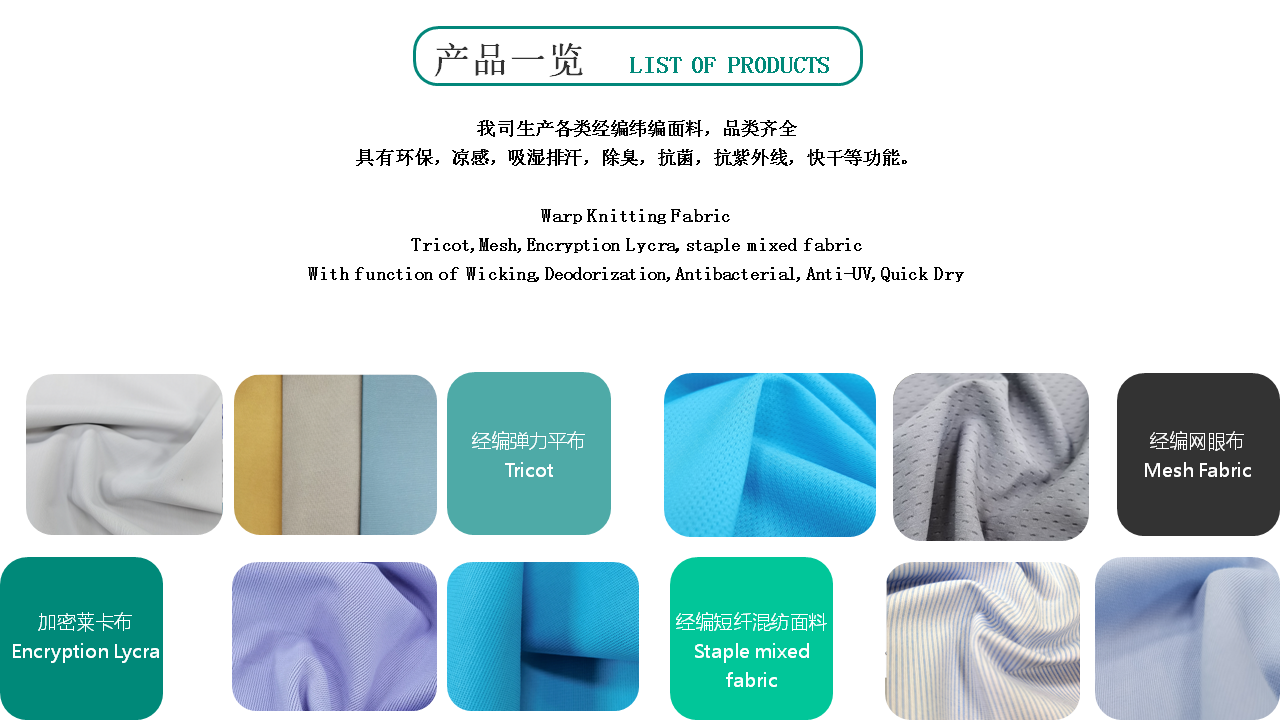 公司創(chuàng)造性的應(yīng)用進(jìn)口生產(chǎn)設(shè)備,精心采購國際優(yōu)質(zhì)原材料和染 化料,所生產(chǎn)的彈性和尼龍面料制作各種泳衣、潛水服、內(nèi)衣、 文胸、睡衣的理想面料,具有穿著舒適,觸感輕柔、恢復(fù)性好易 吸汗、不產(chǎn)生靜電等優(yōu)點(diǎn),系列產(chǎn)品被評(píng)為“浙江省高質(zhì)量科技 產(chǎn)品”。生產(chǎn)的網(wǎng)眼、起絨類經(jīng)編面料,更是運(yùn)動(dòng)衣、體操衣、 滑雪衣、球類衣等的上乘面料之選。目前,公司生產(chǎn)的系列面料 已通過Oeko-Tex Standard 100生態(tài)紡織品認(rèn)證,品質(zhì)達(dá)到 國際先進(jìn)水平,批量配套阿迪達(dá)斯等世界著名品牌,遠(yuǎn)銷歐美。
